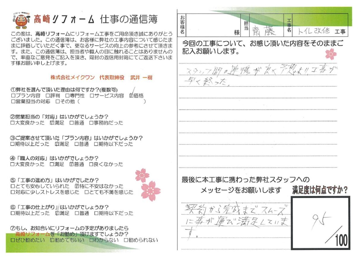 高崎リフォーム|お客様の声|高崎市下豊岡町 N様邸~<トイレ改修工事>~ プライバシーポリシー - キッチン - 浴室 - トイレ - 洗面 - 水廻り4点 - その他リビング等 - 外壁塗装 - 全面改装 - エコキュート・給湯器 - 全て見る スタッフ紹介 お客様の声 会社概要