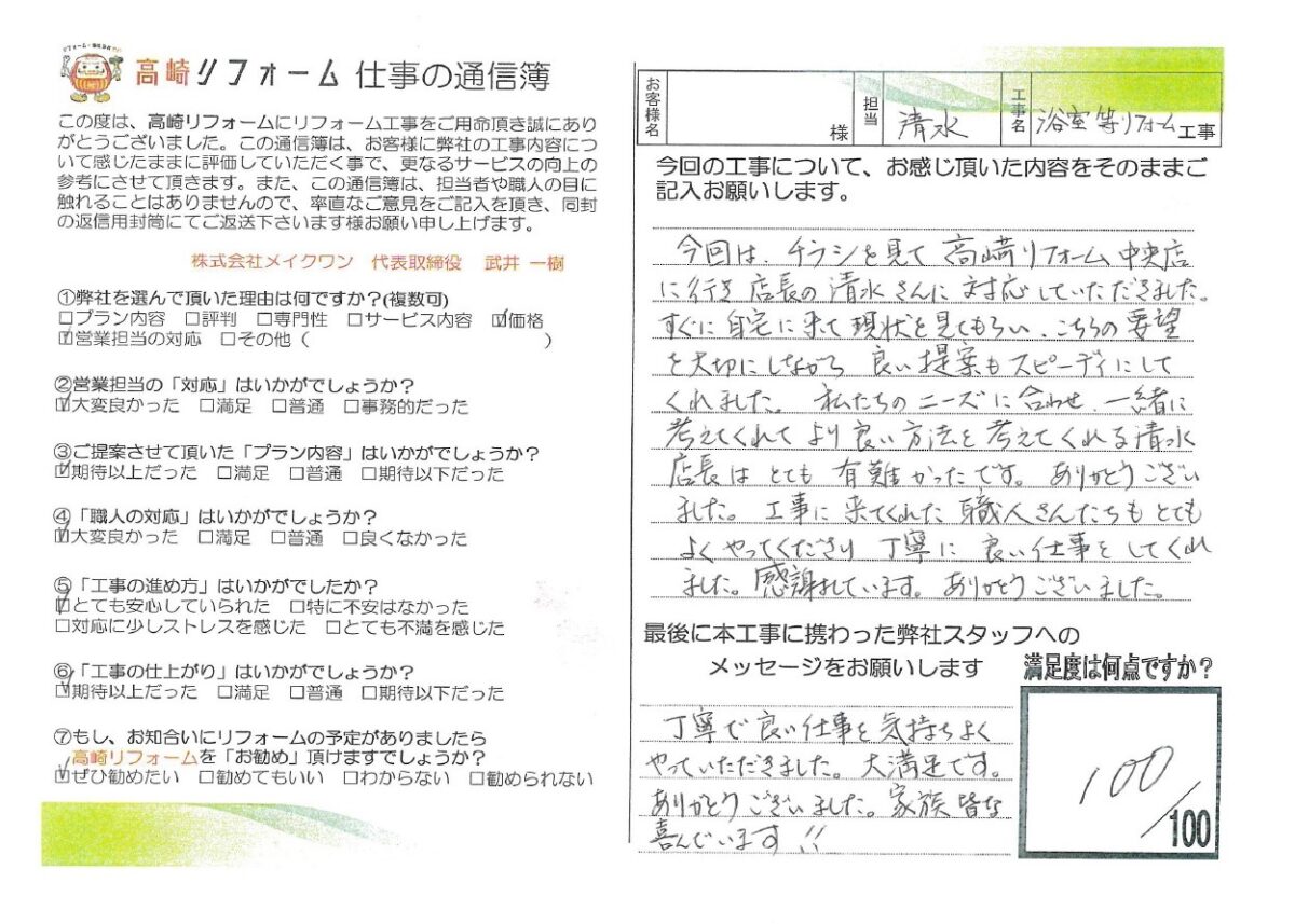 高崎リフォーム|お客様の声|高崎市羅漢町 A様邸 ~<浴室等リフォーム工事>~ プライバシーポリシー - キッチン - 浴室 - トイレ - 洗面 - 水廻り4点 - その他リビング等 - 外壁塗装 - 全面改装 - エコキュート・給湯器 - 全て見る スタッフ紹介 お客様の声 会社概要