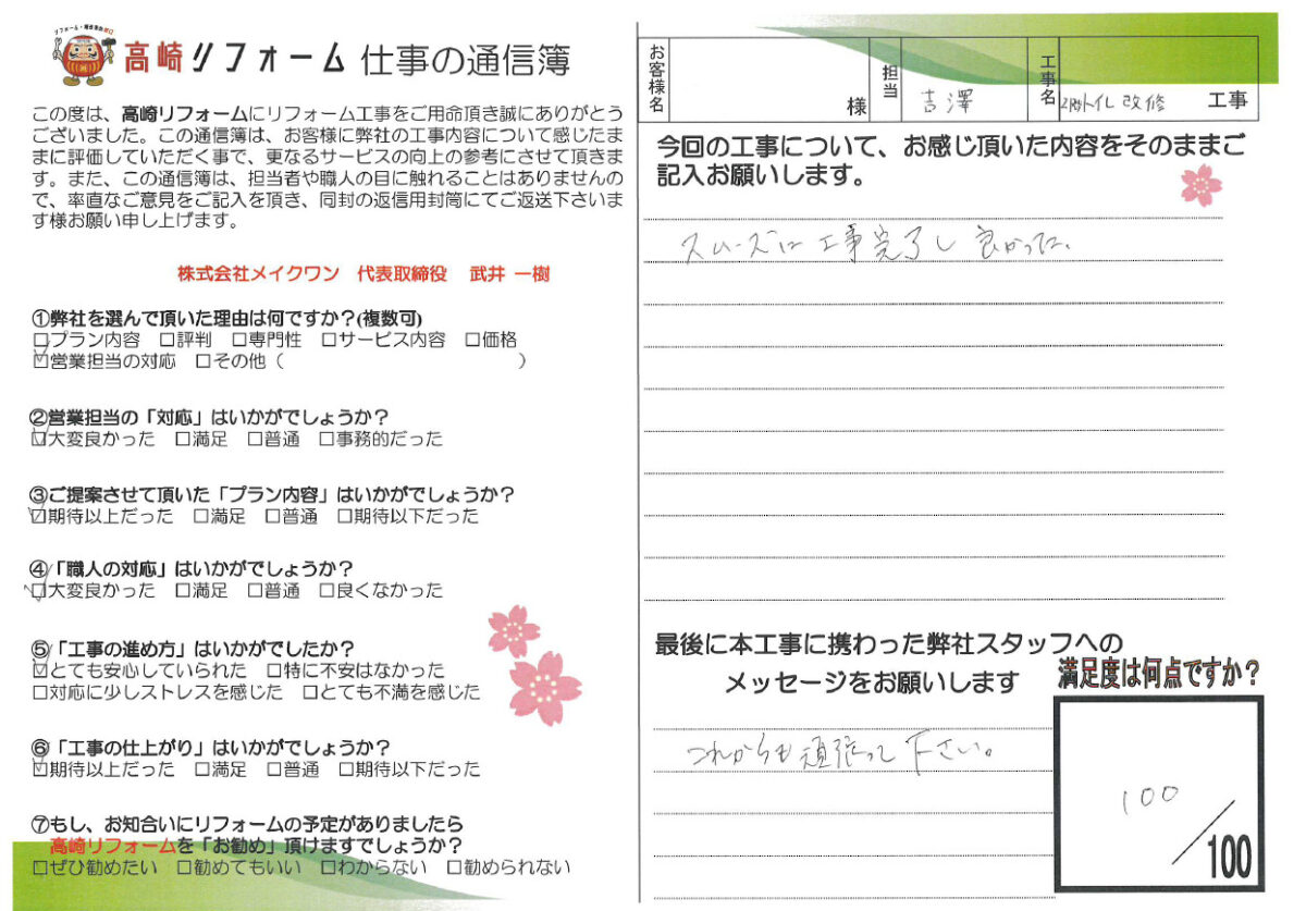 高崎リフォーム|お客様の声|高崎市高浜町 K様邸~<2階トイレ改修工事>~ プライバシーポリシー - キッチン - 浴室 - トイレ - 洗面 - 水廻り4点 - その他リビング等 - 外壁塗装 - 全面改装 - エコキュート・給湯器 - 全て見る スタッフ紹介 お客様の声 会社概要