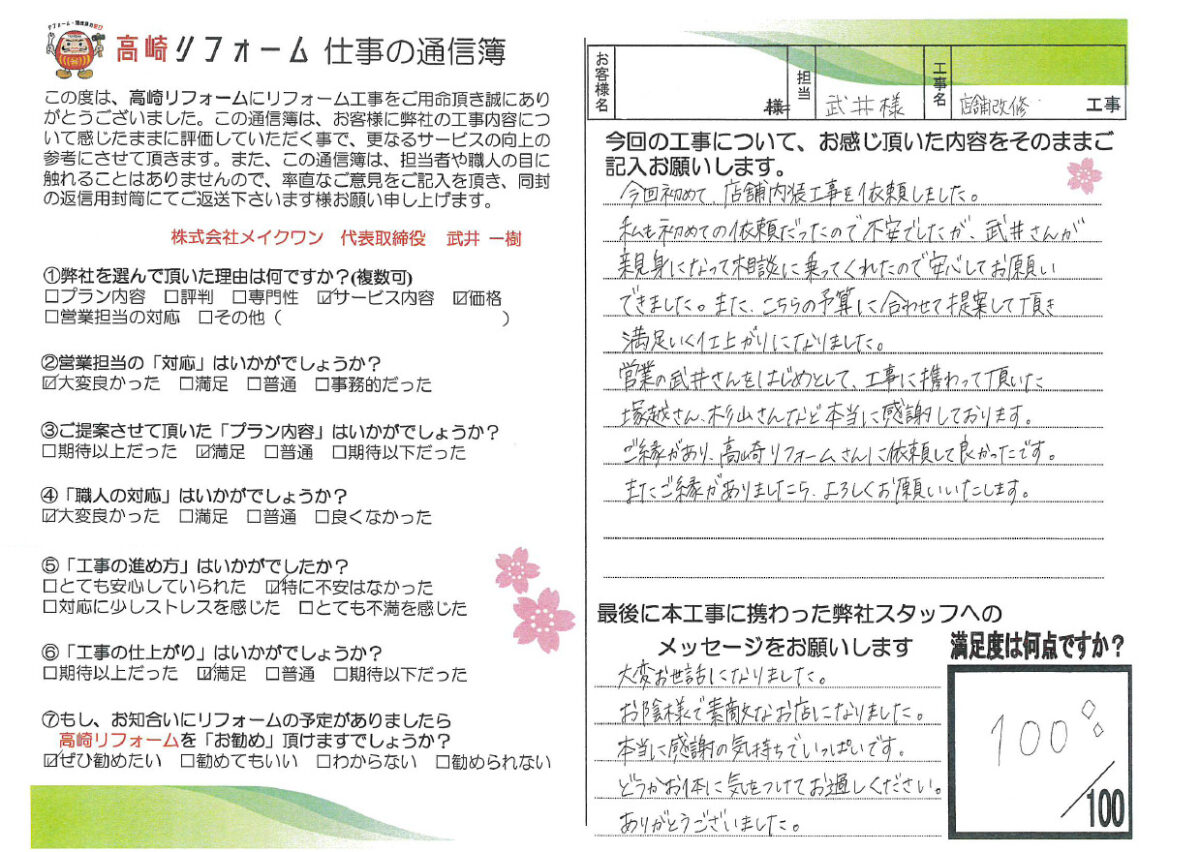 高崎リフォーム|お客様の声|高崎市棟高町 M様邸~<店舗改修工事>~ プライバシーポリシー - キッチン - 浴室 - トイレ - 洗面 - 水廻り4点 - その他リビング等 - 外壁塗装 - 全面改装 - エコキュート・給湯器 - 全て見る スタッフ紹介 お客様の声 会社概要