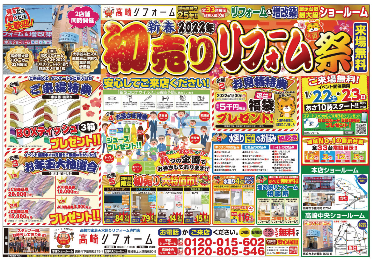 1/22・23 新春イベント開催のご案内 2022.01.21 イベント案内 prev. 新年のご挨拶 2022.01.06 next. 1月 初売りチラシのご紹介 2022.01.21 NEW TOPICS 1/18・19 新春初売りリフォーム祭開催のご案内 2025.01.13 新年のご挨拶 2025.01.01 年末年始のお知らせ 2024.12.27 CATEGORY お知らせイベント案内キャンペーン採用情報その他