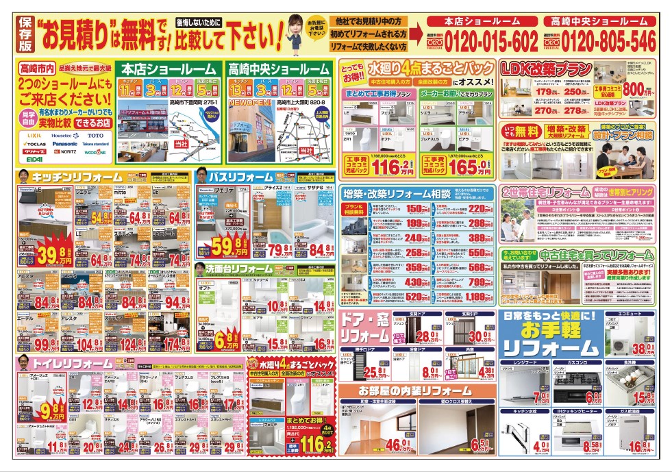 高崎リフォーム|新着情報&キャンペーン1/22・23 新春イベント開催のご案内 プライバシーポリシー - キッチン - 浴室 - トイレ - 洗面 - 水廻り4点 - その他リビング等 - 外壁塗装 - 全面改装 - エコキュート・給湯器 - 全て見る スタッフ紹介 お客様の声 会社概要