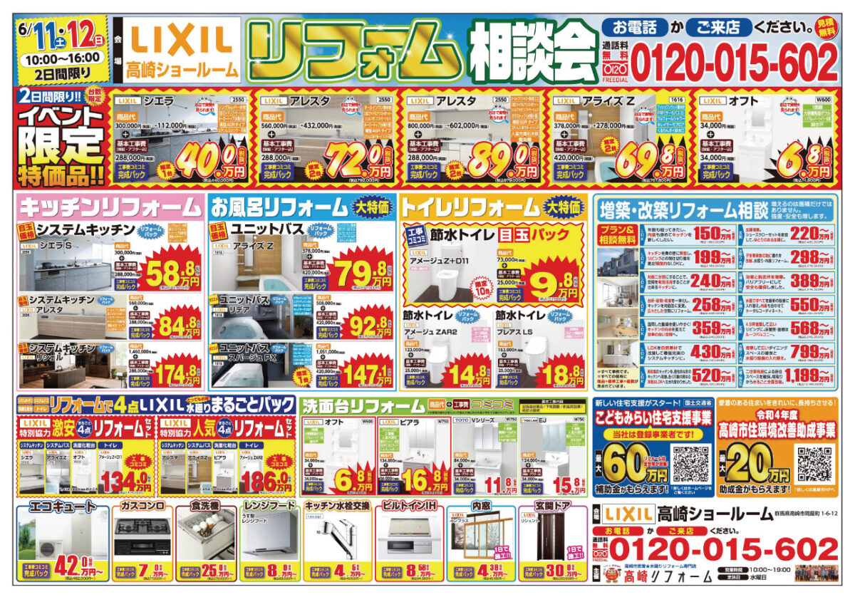 6/11・12の2日間 LIXIL高崎ショールームにてリフォーム相談会を開催いたします。