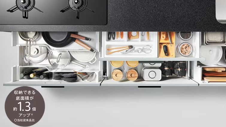 ※1 キッチン奥行65cm、調理台キャビネットの上段または中段の引出しで、ロングスライドレールの場合です。備しています。