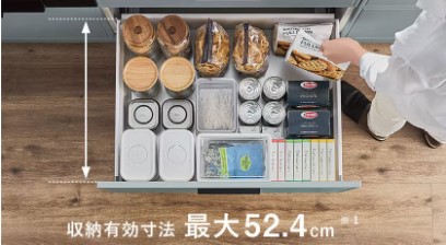 奥行きいっぱいまで使えて出し入れも便利な大型Aの引出しです。長さのあるものはもちろん、さまざまな道具や食品をたっぷりしまえます。収納物の転倒を防ぐサイドフェンスも標準装備しています。