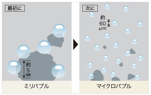ミリバブル(直径約5mm)で大きな汚れを強力に除去し、次に微細なマイクロバブル(直径約60μm)で小さな汚れを除去します。