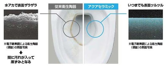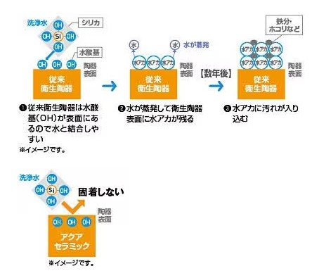衛生陶器表面に水酸基が出ない構造とすることで、水アカの固着を化学的に防ぎ、日頃のお手入れで水アカを落とし、いつでもキレイを保てます。